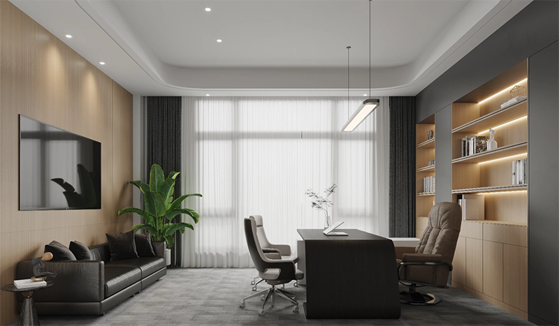 在小型辦公室中,充足的自然光能夠讓空間看起來更加寬敞和宜人。設計師應盡量避免使用厚重的窗簾,選擇透光性強的輕質材料,確保室內充滿自然光。如果自然光不足,則應使用色溫適宜的人工照明系統,避免昏暗的環境讓員工產生疲勞感。此外,通透的設計元素如玻璃隔斷和開放式布局,可以讓空間看起來更加流動和開闊。